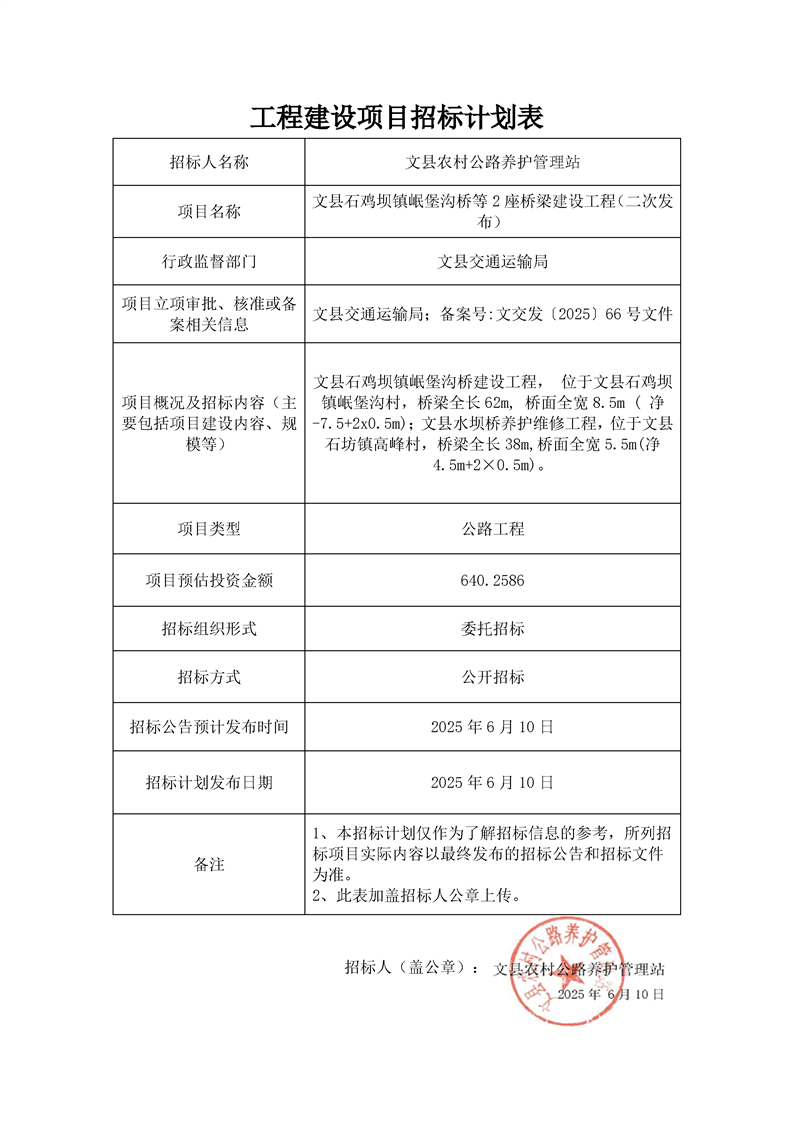 文縣石雞壩鎮(zhèn)岷堡溝橋等2座橋梁建設(shè)工程(二次發(fā)布)