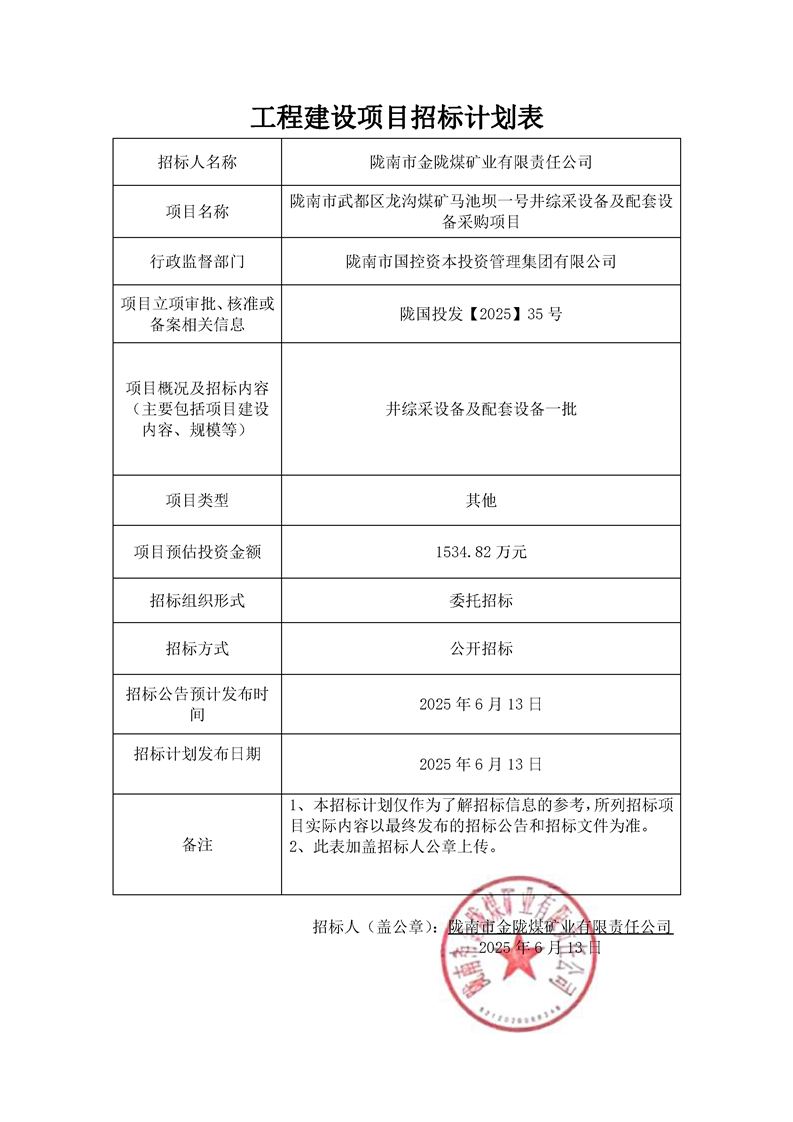 隴南市武都區(qū)龍溝煤礦馬池壩一號井綜采設(shè)備及配套設(shè)備采購項目
