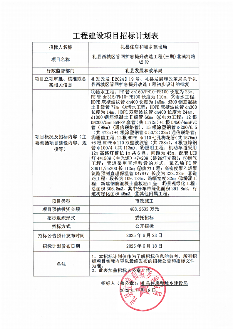 禮縣西城區(qū)管網(wǎng)擴容提升改造工程(三期)北濱河路A2段