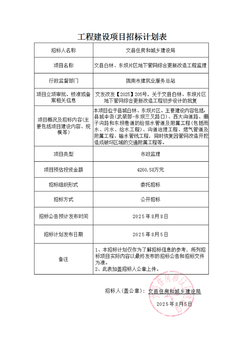 文縣白林、東壩片區(qū)地下管網(wǎng)綜合更新改造工程監(jiān)理