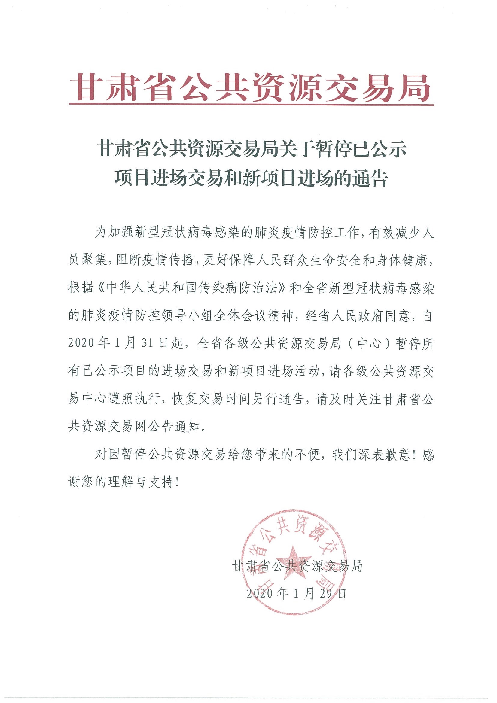 甘肅省公共資源交易局關(guān)于暫停已公示項目進(jìn)場交易和新項目進(jìn)場的通告